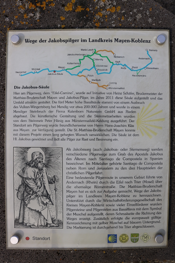 Die Jakobus-Säule befindet sich am Eifel-Camino direkt an der alten Römerstraße zwischen Mayen und Monreal. Die fünf Meter hohe Säule wurde auf Initiative der Sankt-Matthias-Bruderschaft Mayen im Jahre 2011 aufgestellt. Die Basaltsäule stammt von einem Ausbruch des Wingertsberg-Vulkans bei Mendig.