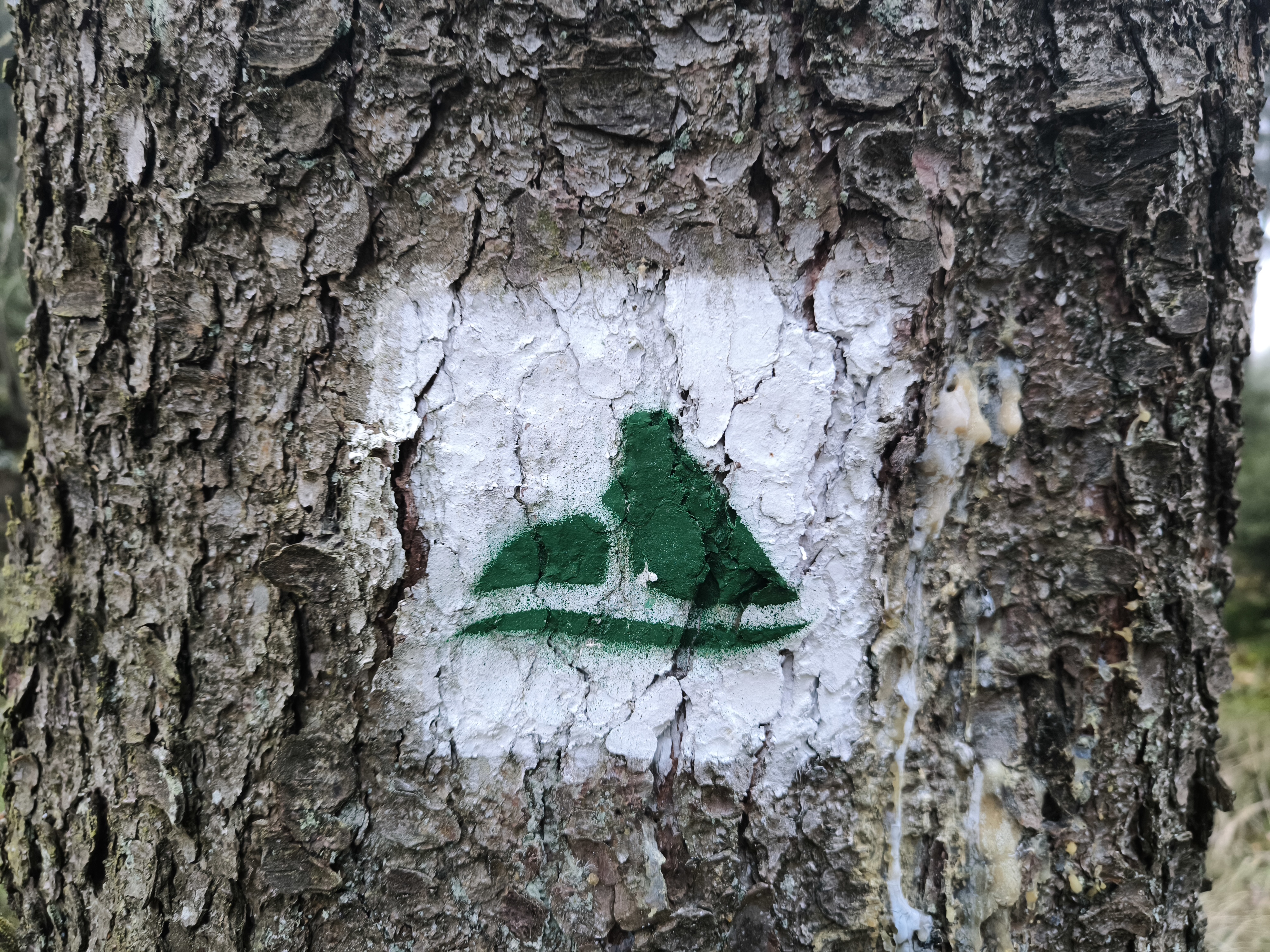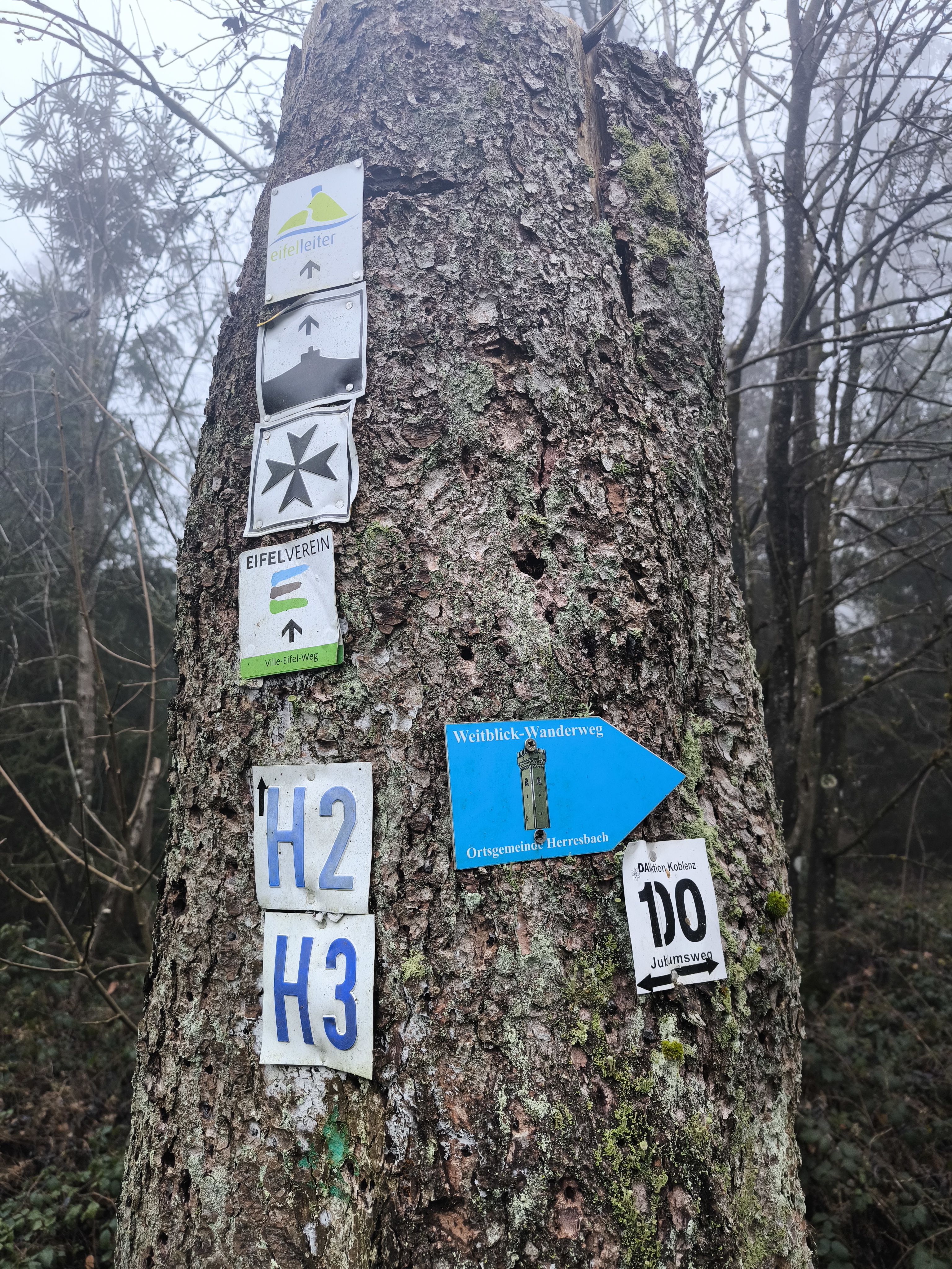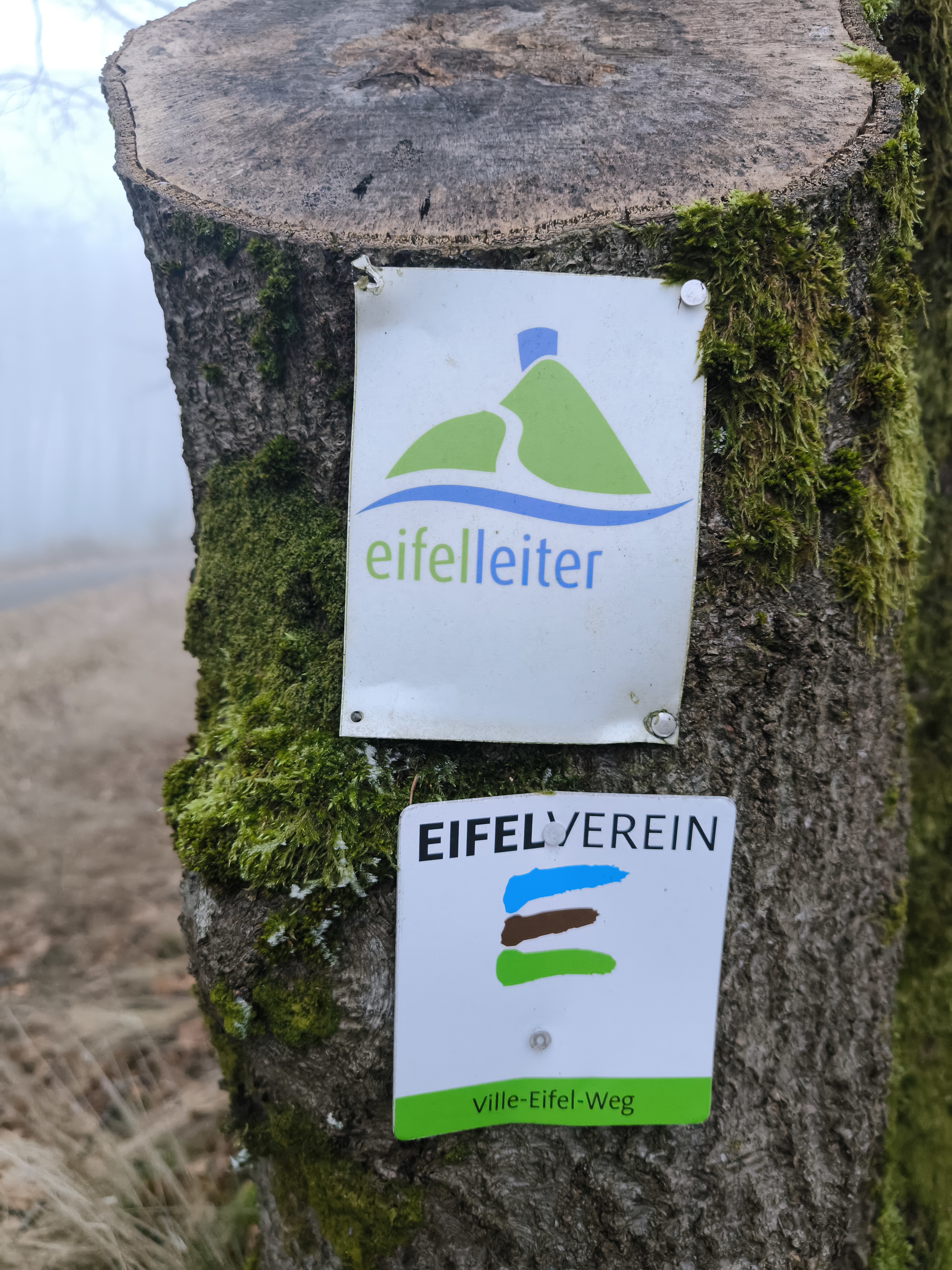 Mit jedem Höhenmeter wurde der Nebel dichter. Wegweiser, Markierungen und Infotafeln tauchten plötzlich aus dem Grau auf und verschwanden genauso schnell wieder. Besonders auffällig: die Markierungen der Eifelleiter, eines Premiumwanderwegs, der in mehreren Etappen vom Rhein bis in die Hocheifel führt.