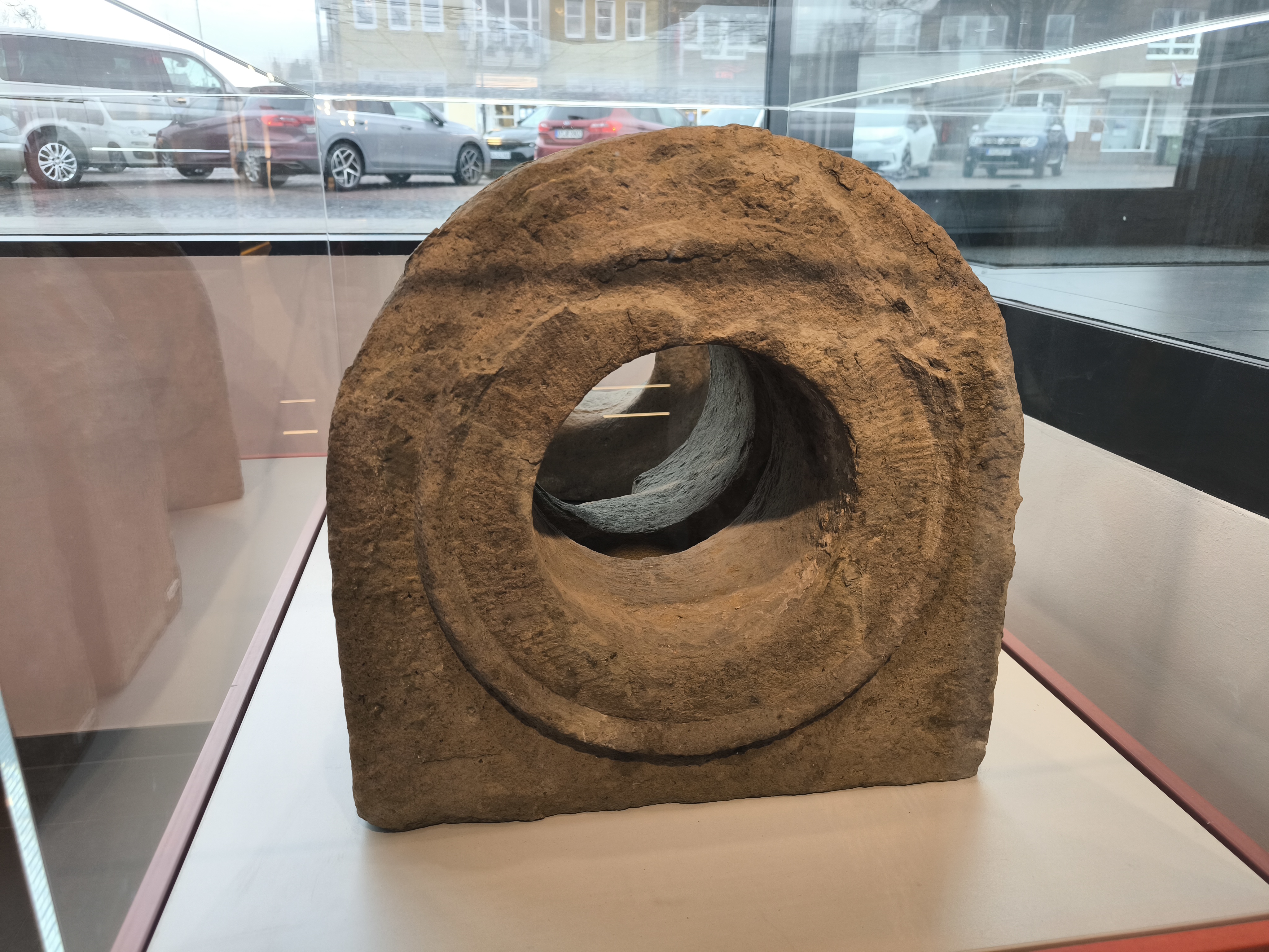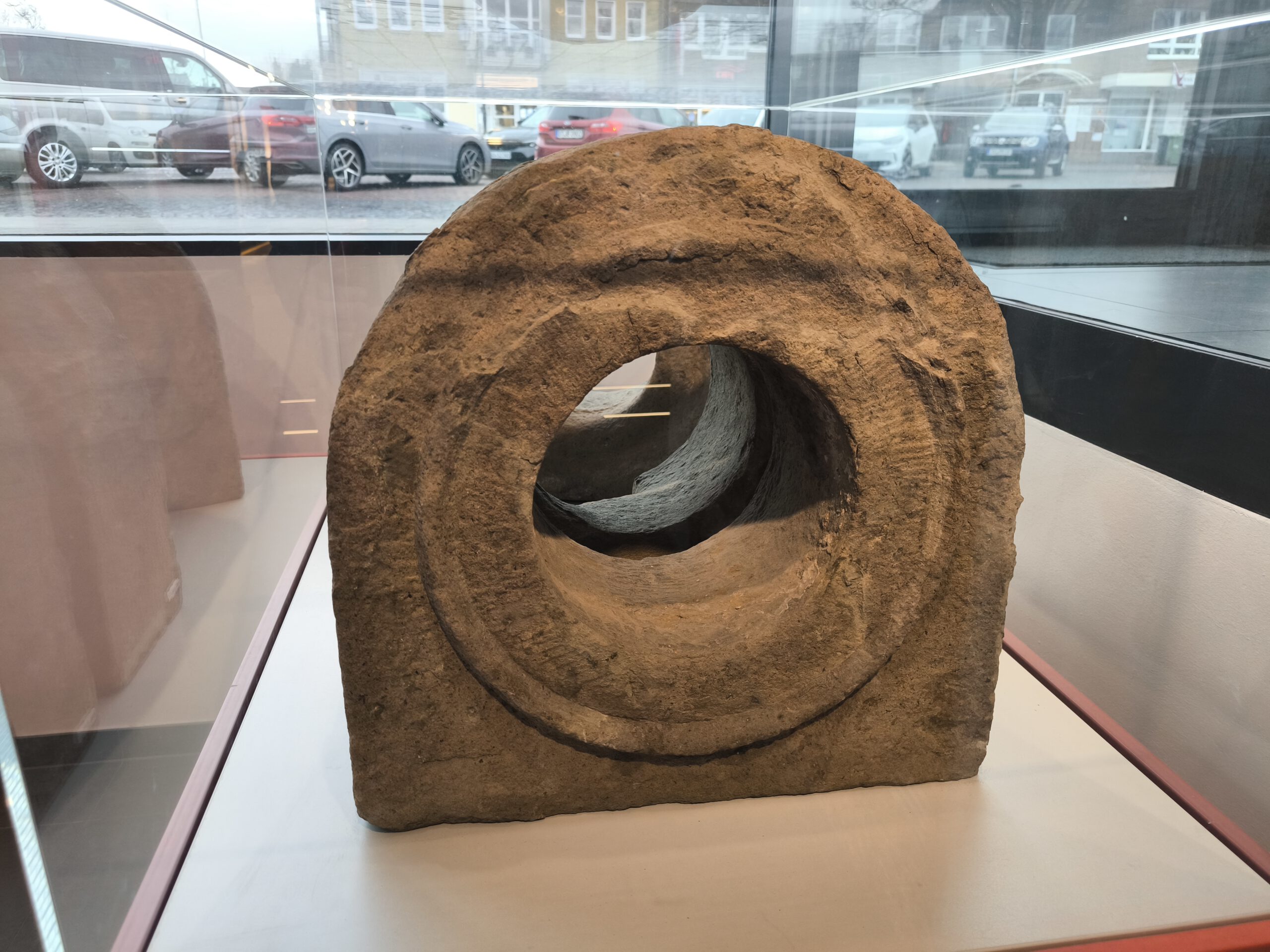Ein massives Steinrohrstück liegt in einer Vitrine – innen rund, außen schwer wie ein Betonklotz. Wenn man das sieht, versteht man, wie dauerhaft die Römer gebaut haben.