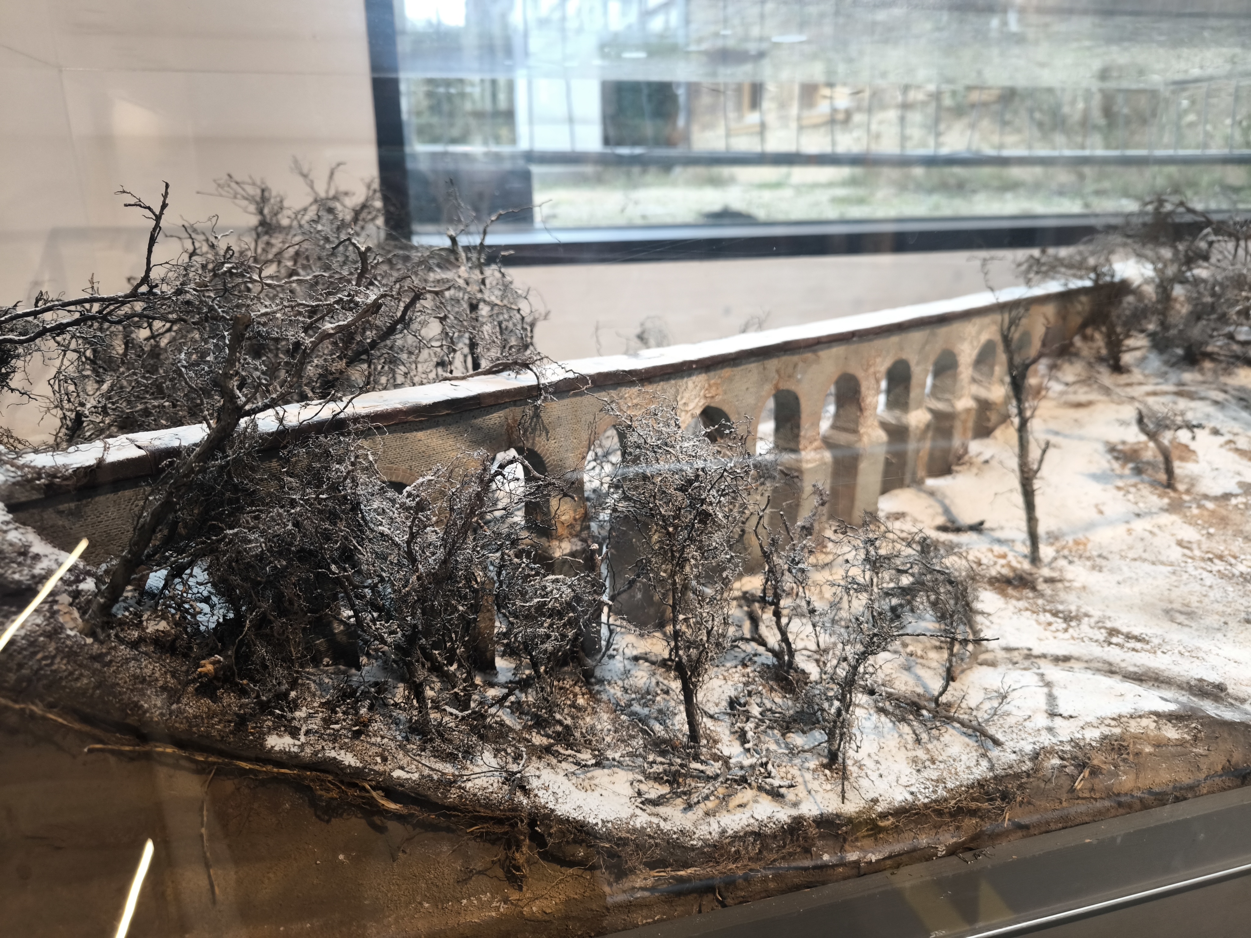 In der Ausstellung ist ein detailreiches Modell der Aquäduktbrücke von Vussem zu sehen. Es zeigt eindrucksvoll, wie die Römer Täler überwanden, um Wasser über weite Strecken zu leiten. Plötzlich entsteht ein Bild im Kopf: Mitten durch das Tal zieht sich eine mächtige römische Brücke – ein Bauwerk, das hier vor fast 2.000 Jahren stand.