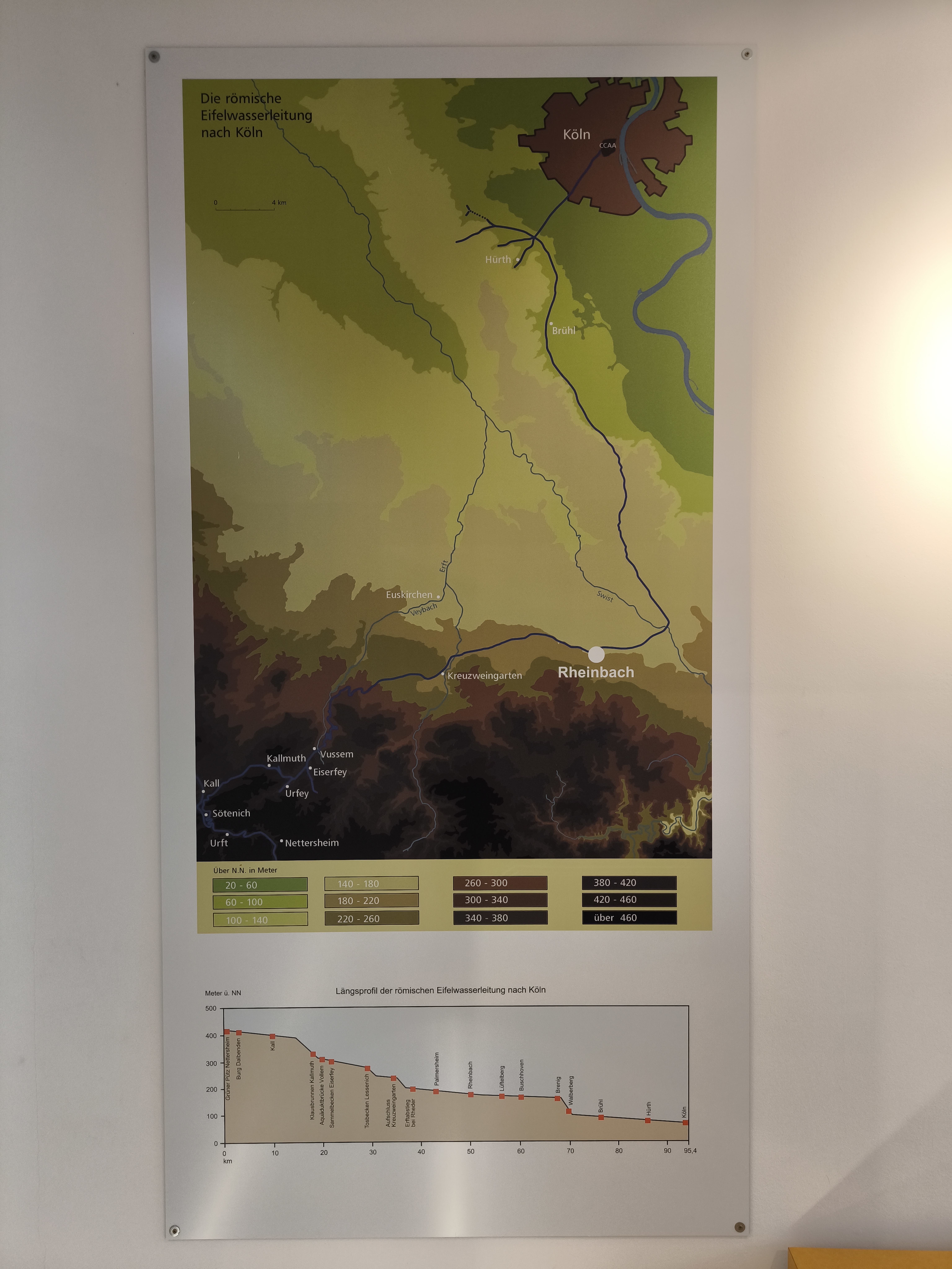Eine große Wandkarte zeigt die gewaltige Strecke der Leitung – von den Quellgebieten in der Eifel bis nach Colonia Claudia Ara Agrippinensium, also Köln. Über viele Kilometer wurde das Wasser mit minimalem Gefälle geführt. Kein Strom, keine Pumpen – nur Gefälle, Planung und Präzision.