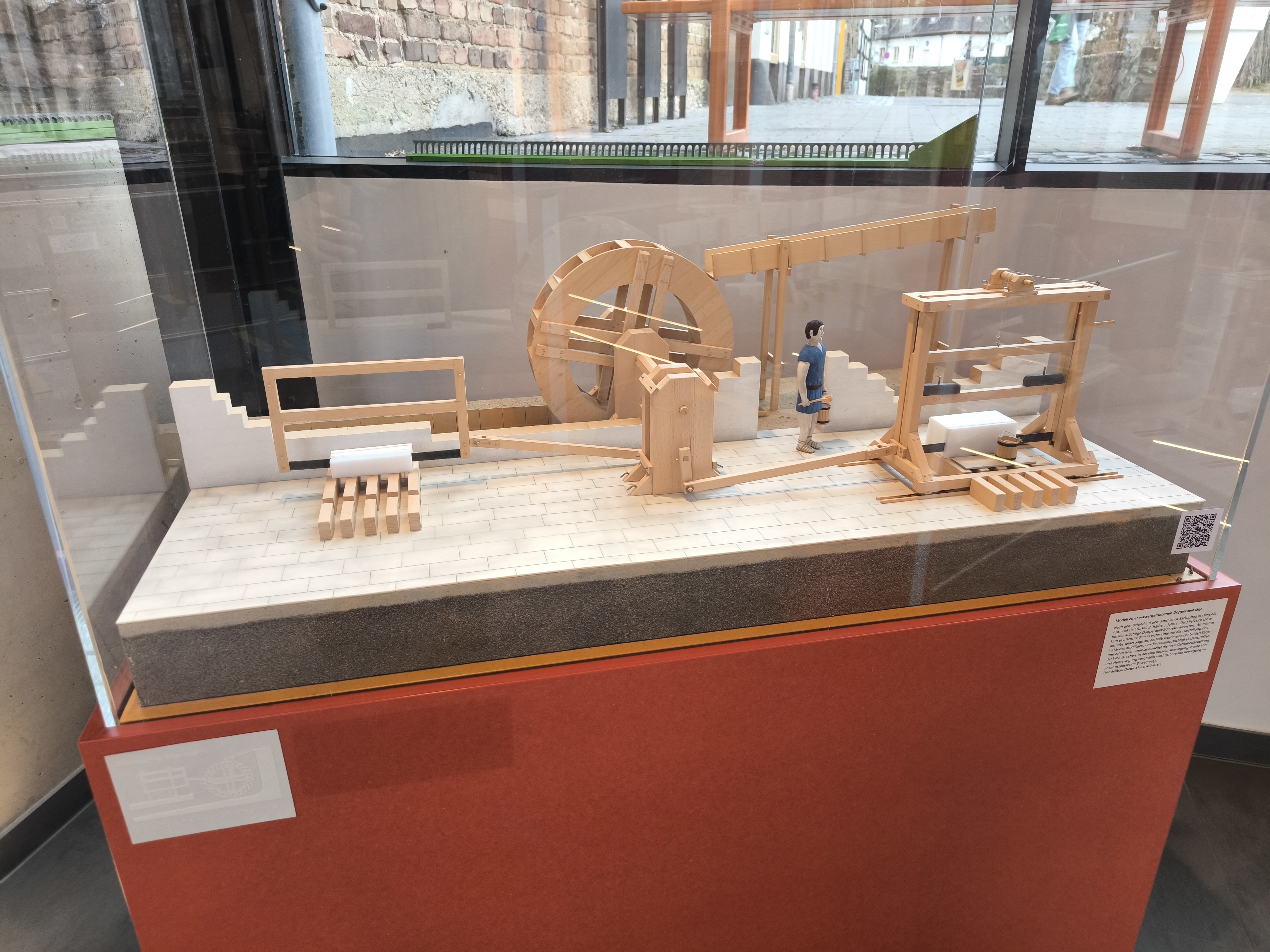 Ein Modell zeigt römische Maschinen – mit Wasserrad, Zahnrädern, Kurbelbewegung. Technik, die man eher im Mittelalter erwarten würde, war hier schon in der Antike im Einsatz.
