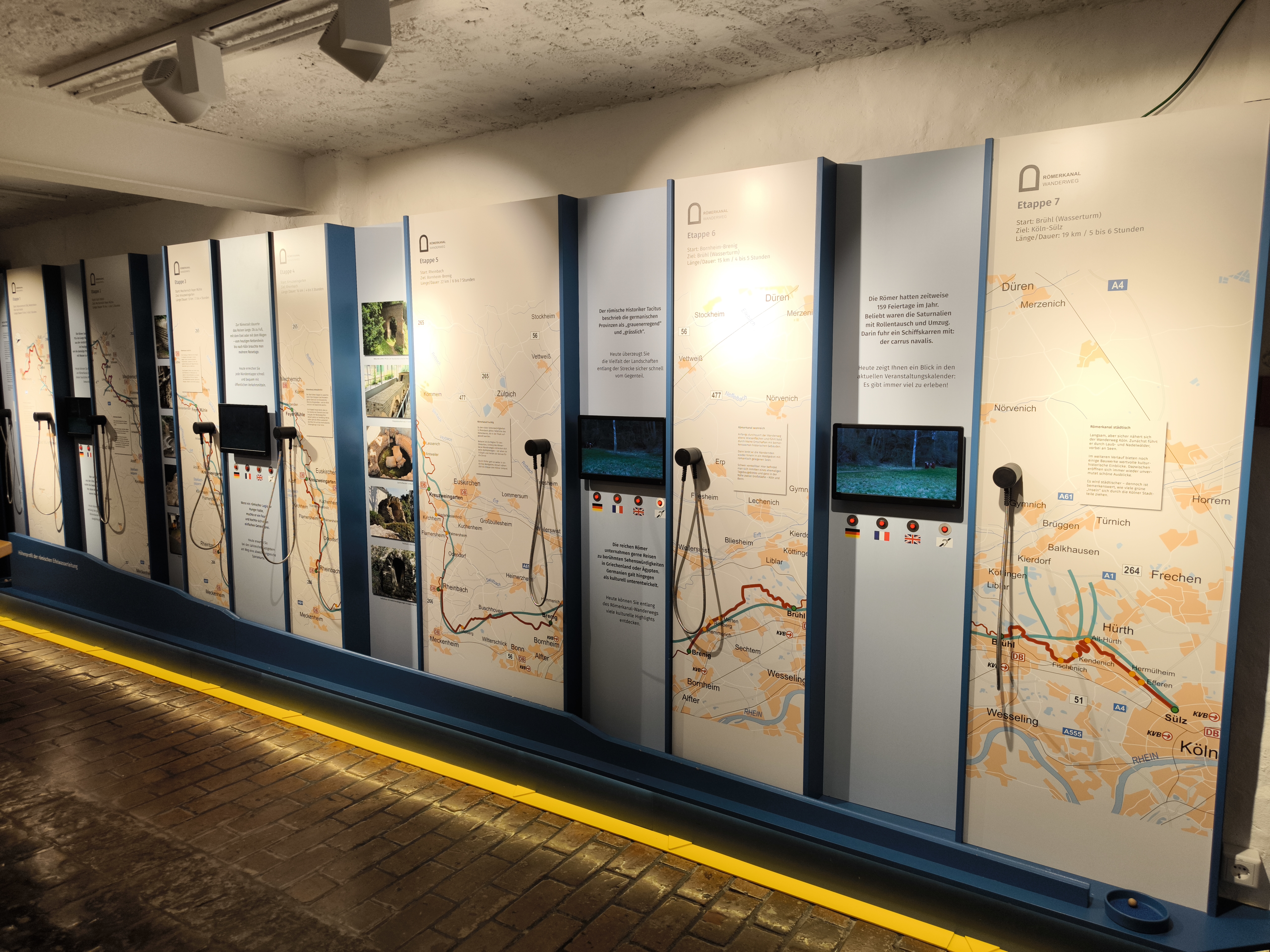 Entlang einer langen Wand wird die Strecke des Römerkanal-Wanderwegs in Etappen erklärt – mit Karten, Fotos, kleinen Monitoren und Hörstationen. So wird aus einer alten Leitung eine richtig greifbare Geschichte.