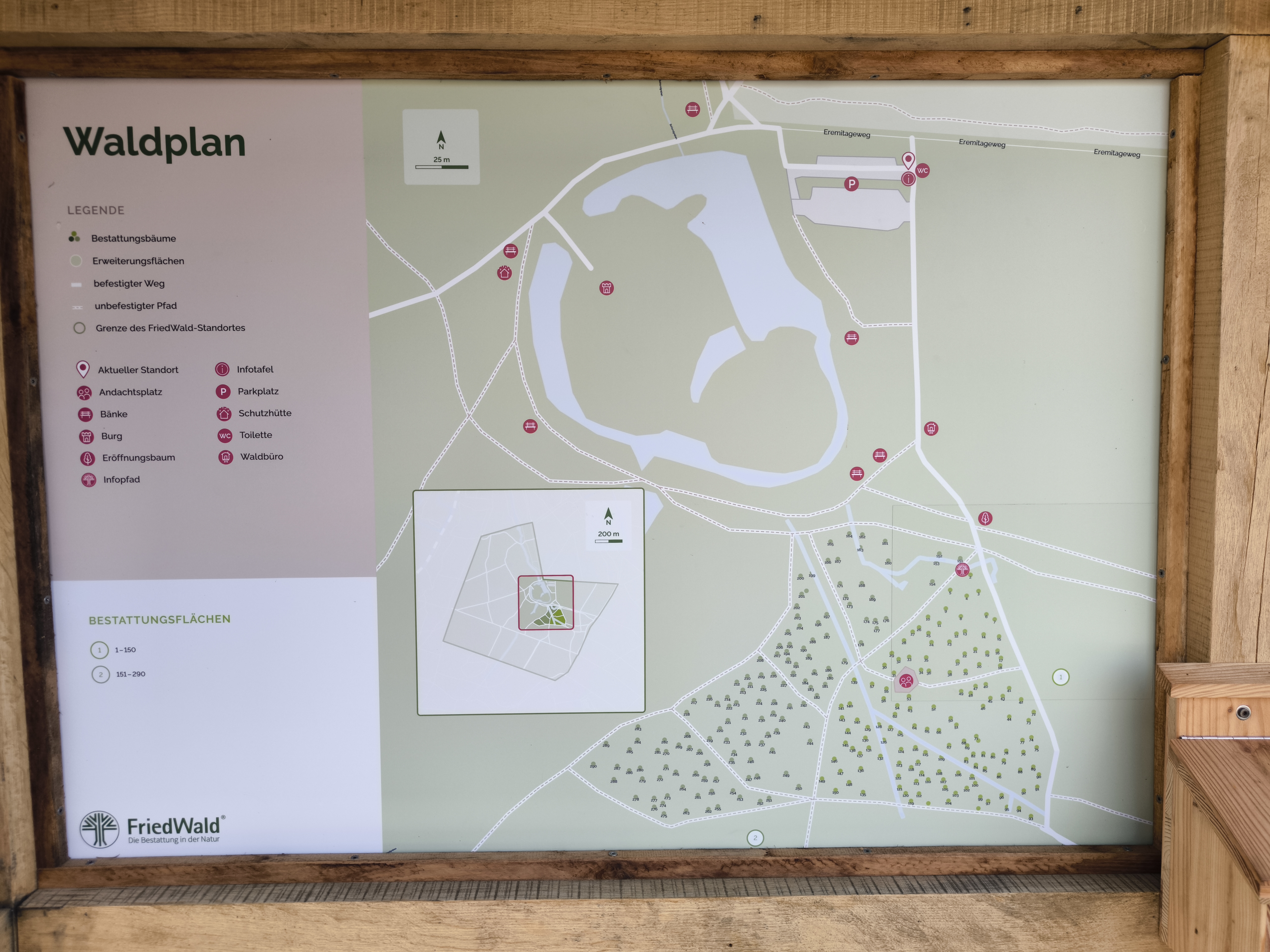 Sehr angenehm ist auch die gute Erreichbarkeit. Man kann bequem auf dem Parkplatz an der Hardtburg parken. Von dort führen gut ausgebaute und barrierefreie Wege direkt in den FriedWald. Dadurch ist der Bereich auch für Menschen mit eingeschränkter Mobilität gut zugänglich. Am Parkplatz befindet sich außerdem eine rollstuhlgerechte Toilette.