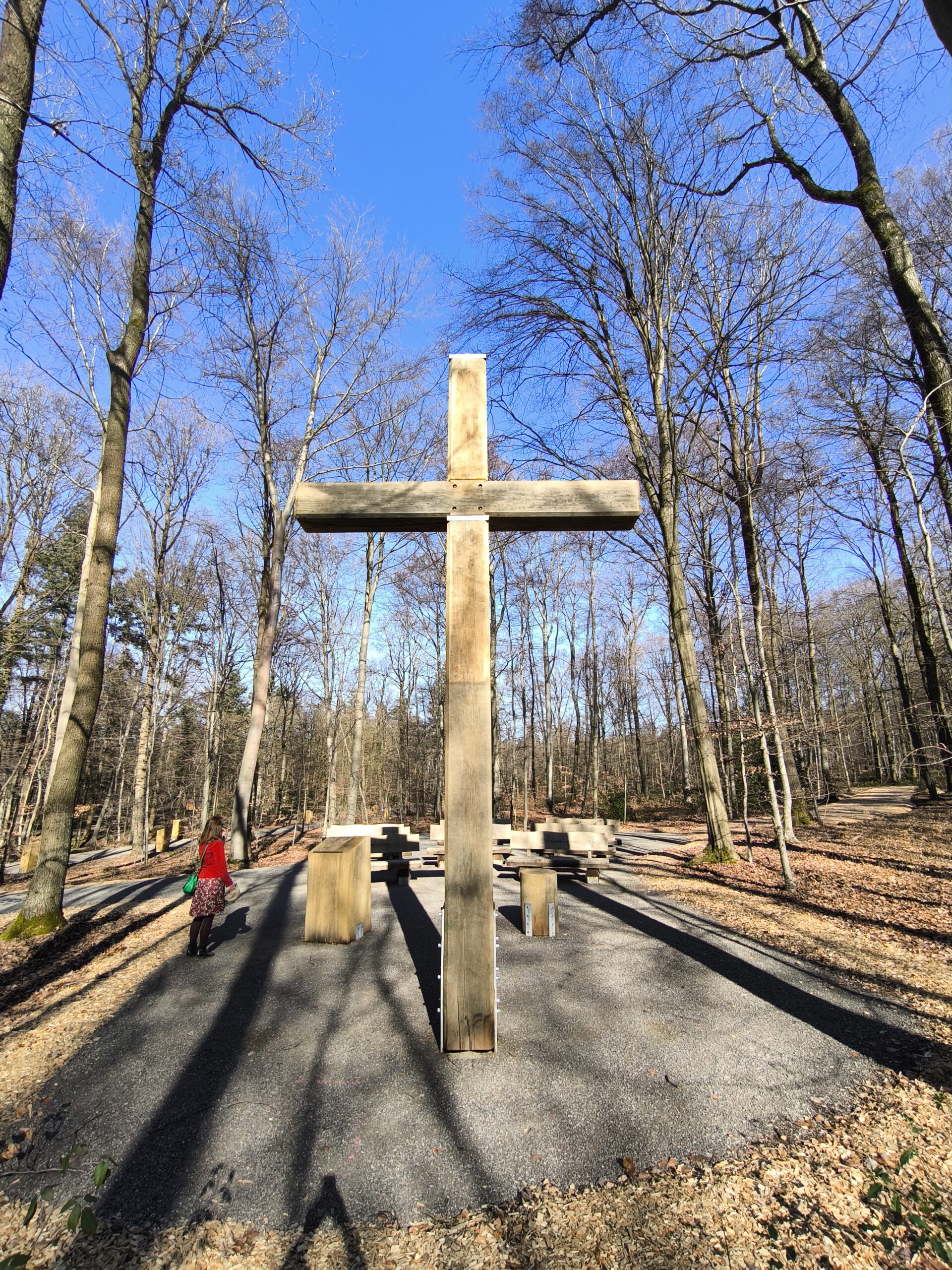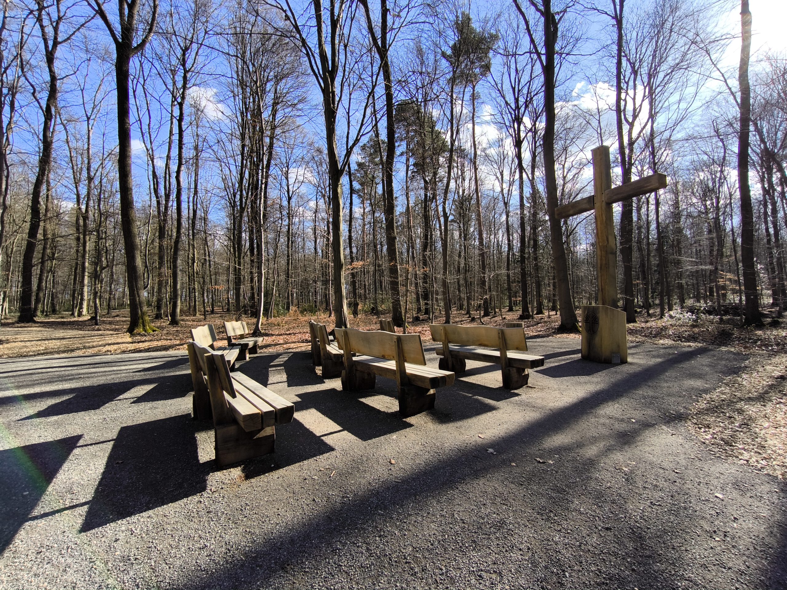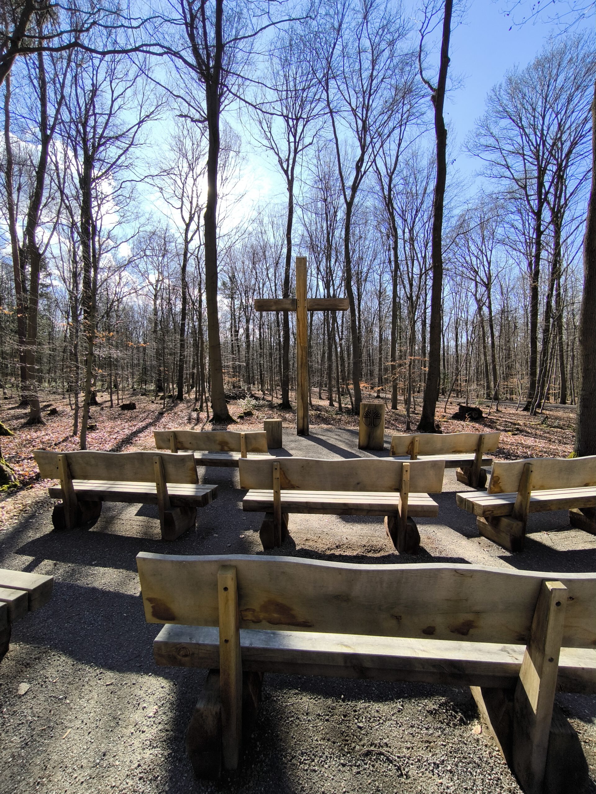 Besonders schön gestaltet ist der Andachtsplatz. Dort steht ein großes Holzkreuz, umgeben von massiven Holzbänken. Ein Platz zum Innehalten, zum Nachdenken oder einfach zum stillen Verweilen.